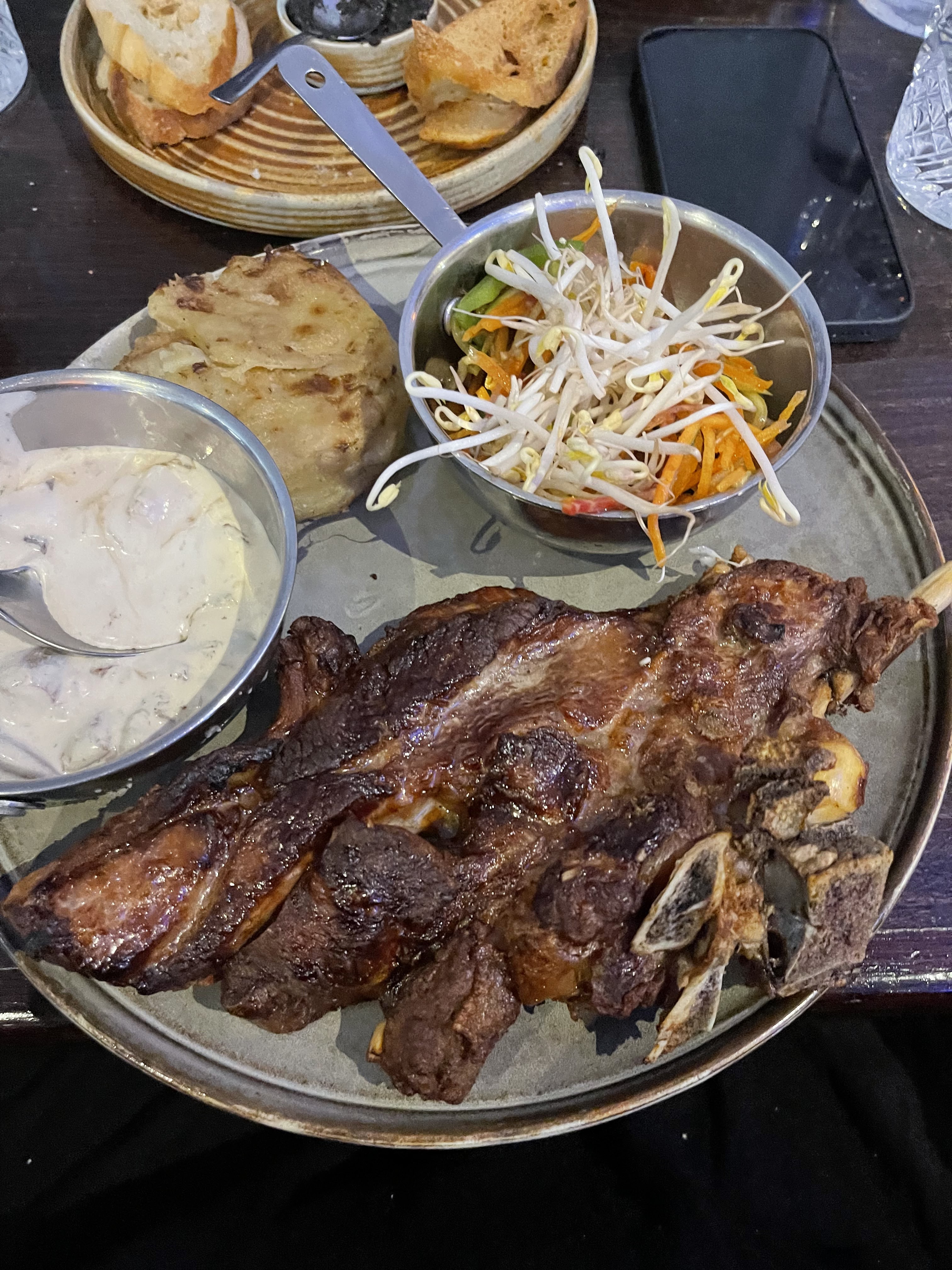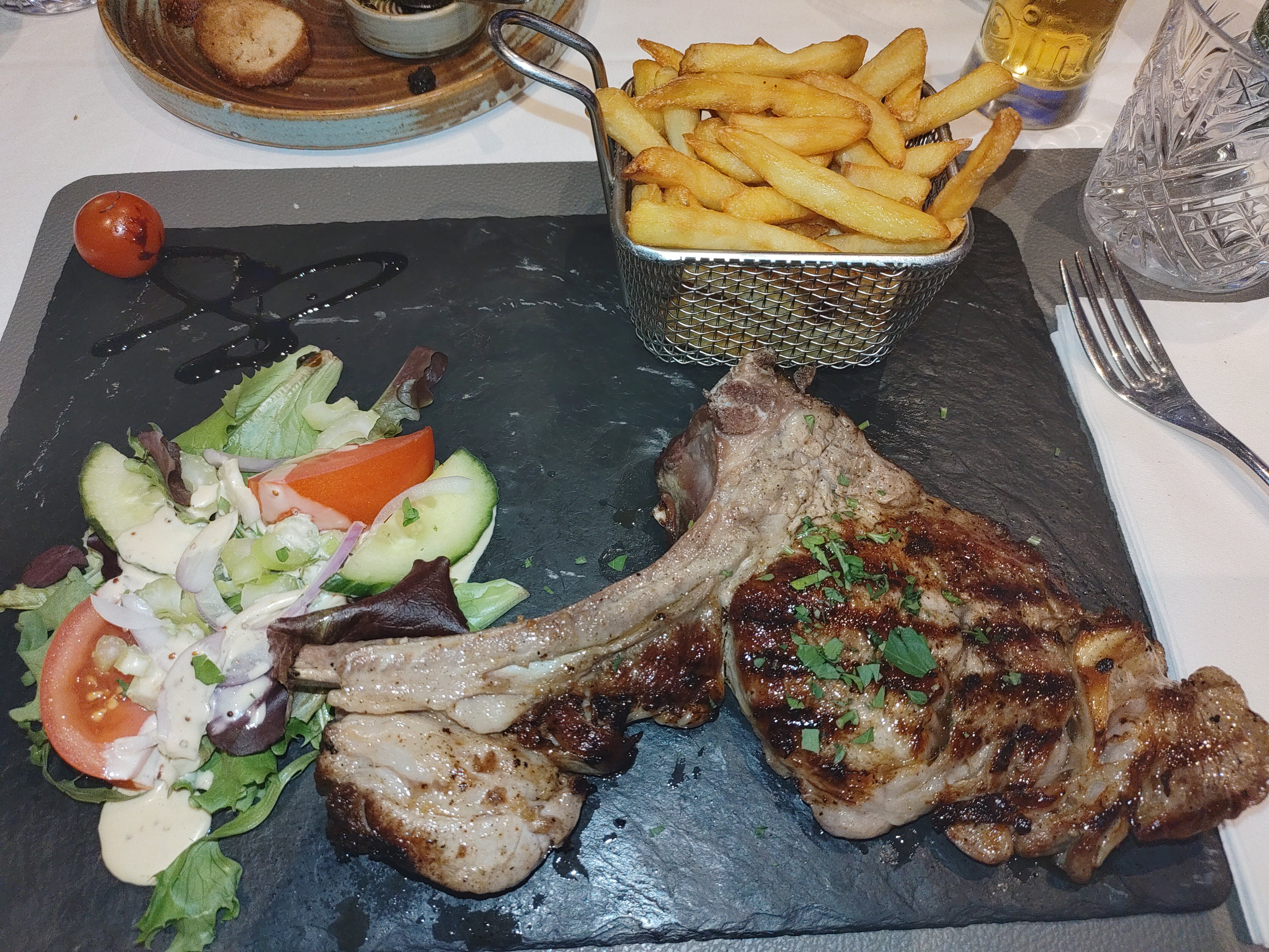 Accueil tres chaleureux, Pour commencer petite tapenade offerte en attente de commande, Puis 45 min entre la commande et la mise a table (c’est long quand meme) La viande est de tres bonne qualité mais l’impression d’etre cuite au four (gélatineux).. Accompagnement agréable et doux,mais 35€ quand meme 😅😅