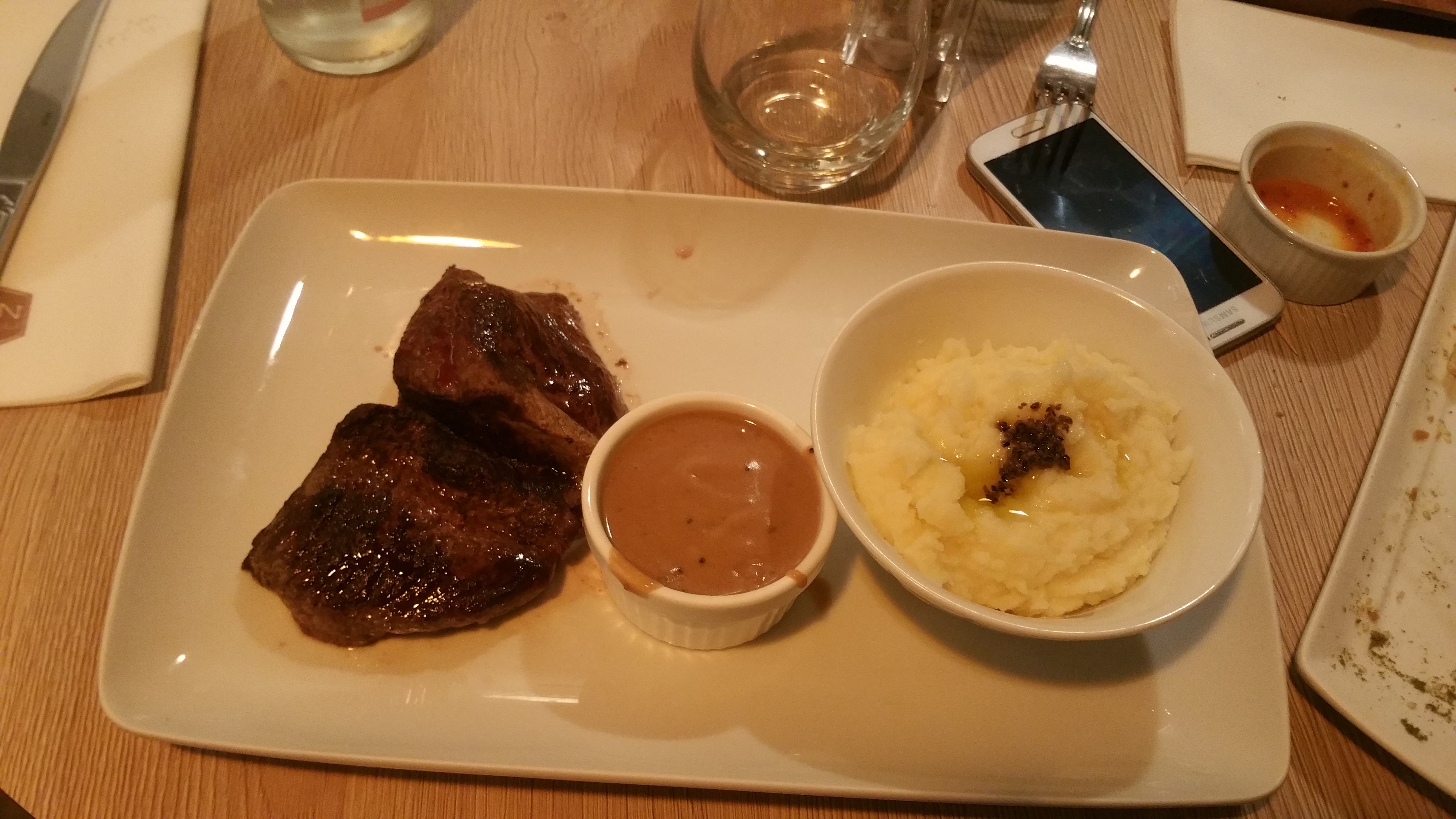 Un service inexistant, très peu aimable au moins 4 serveurs se sont adressés à nous seule la serveuse était agréable. Le serveur qui insiste pour retirer le plat des entrées alors que certain avaient commandés des entrées et souhaitait partager, bref on a du argumentait il tenait tête, ridicule. Pour le prix on s'attend à un service de qualité, la viande est bonne mais vu le prix il manquait quelque chose.