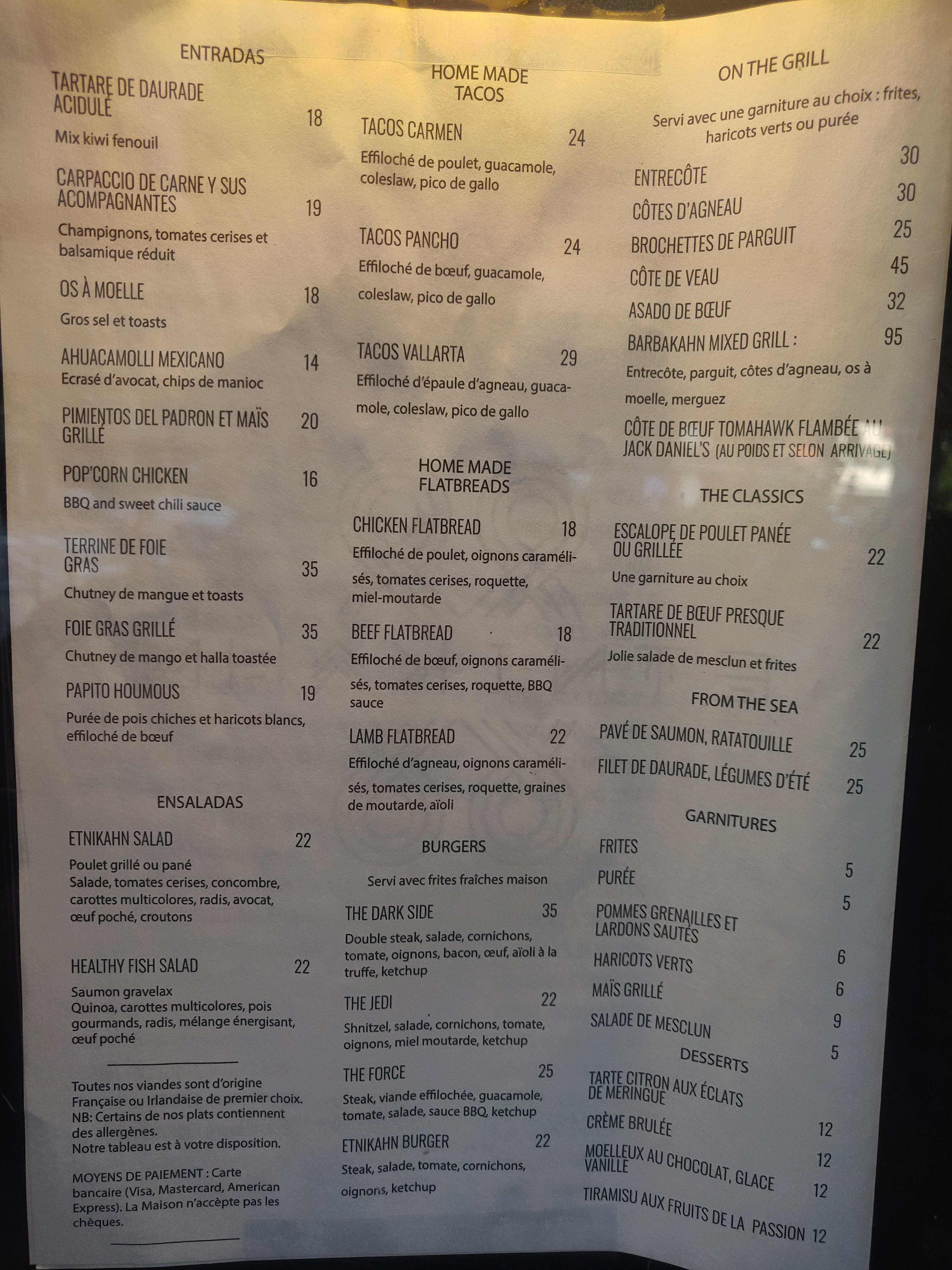On a choisi ce resto pour fêter l’anniversaire d’une copine un dimanche soir, on était 9. Le service et l’ambiance étaient moyennes, le resto pas hyper propres (on était sur un petit renfoncement dans le resto ou le sol collait, il n’a pas dû être lavé depuis longtemps). En revanche la bouffe hyper bonne! La viande bien cuite, l’entrecôte très très bonne, les entrées étaient excellentes. Ce qui m’a déçue c’était à l’heure de payer. Il était minuit, on était la dernière table. Au moment de payer la serveuse qui n’était pas très aimable d’ailleurs, nous dit qu’aucun TPE ne fonctionne (il y en avait 3) et qu’ils ne prennent rien d’autre que des espèces. D’abord, permettez moi d’en douter (pour un dimanche soir une grosse addition je n’étais même pas étonnée), la serveuse a eu le culot de nous demander d’aller retirer à minuit à la machine d’à côté. J’ai trouvé ça très déplacé de demander ça à une bande de jeunes filles le soir. D’autre part, si les TPE ne fonctionnent plus tous en même temps depuis le début de soirée (je n’y crois toujours pas), la moindre des choses est de prévenir les clients avant et pas à minuit au moment de payer. En résumé, on a très bien mangé, mais pour tout le reste on repassera.