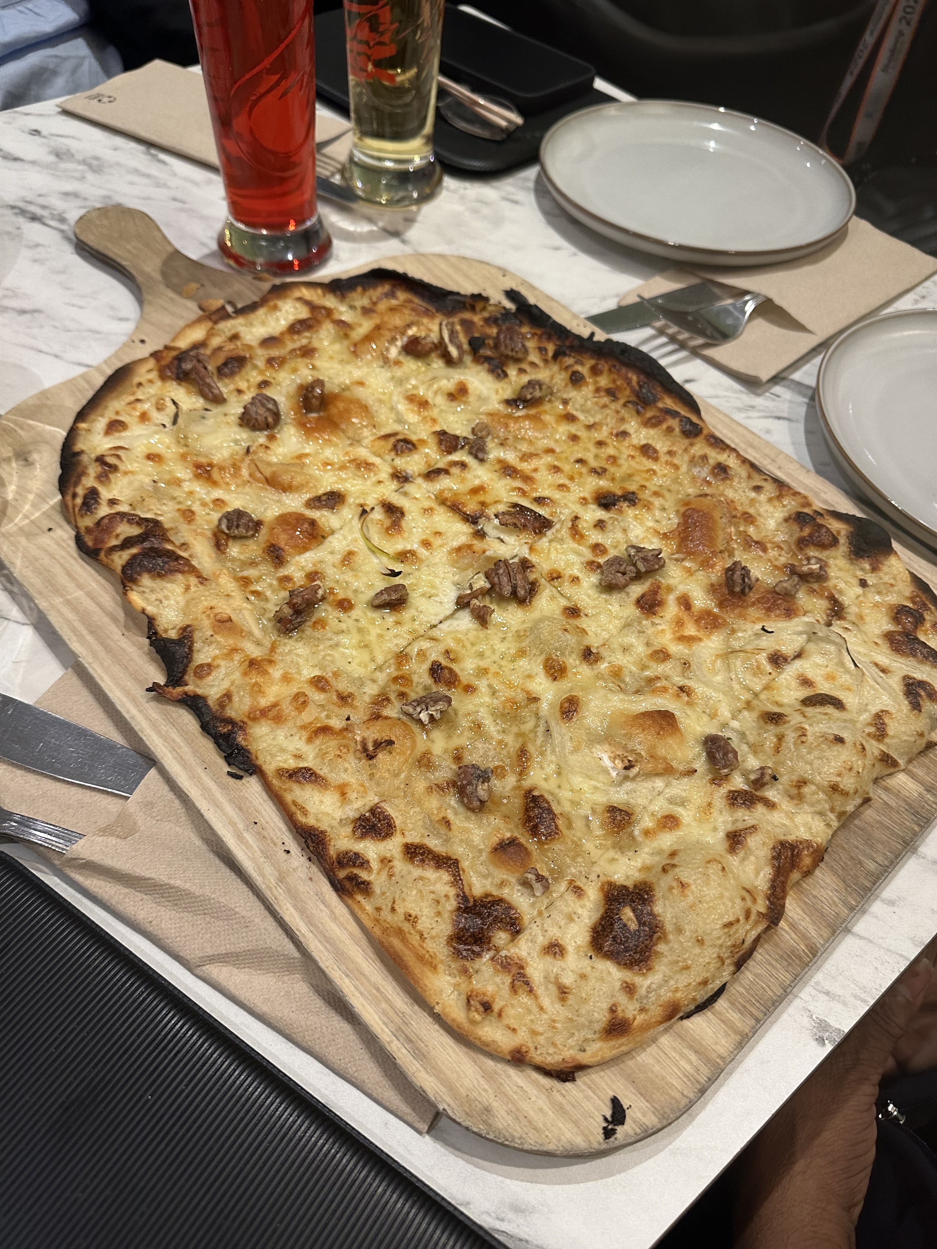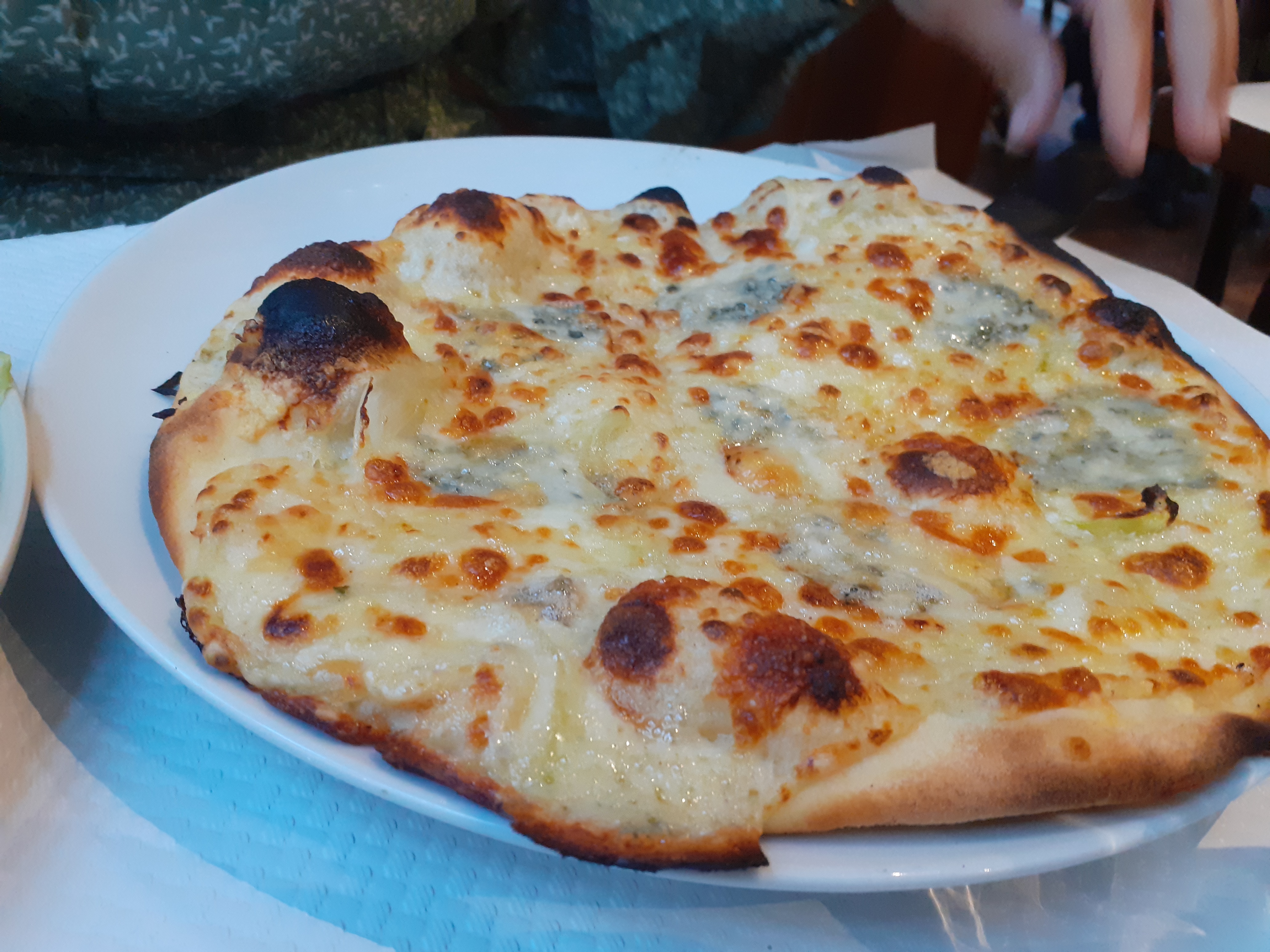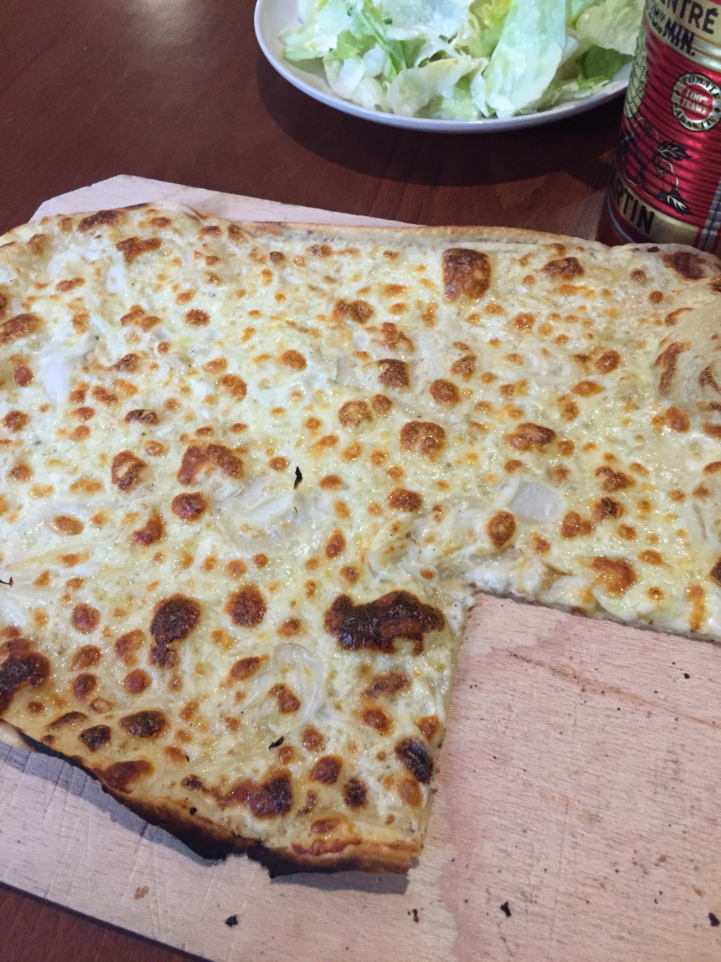 Flammekueche qu'elle surprise , un délice. Et la pizza au pesto extraordinaire.