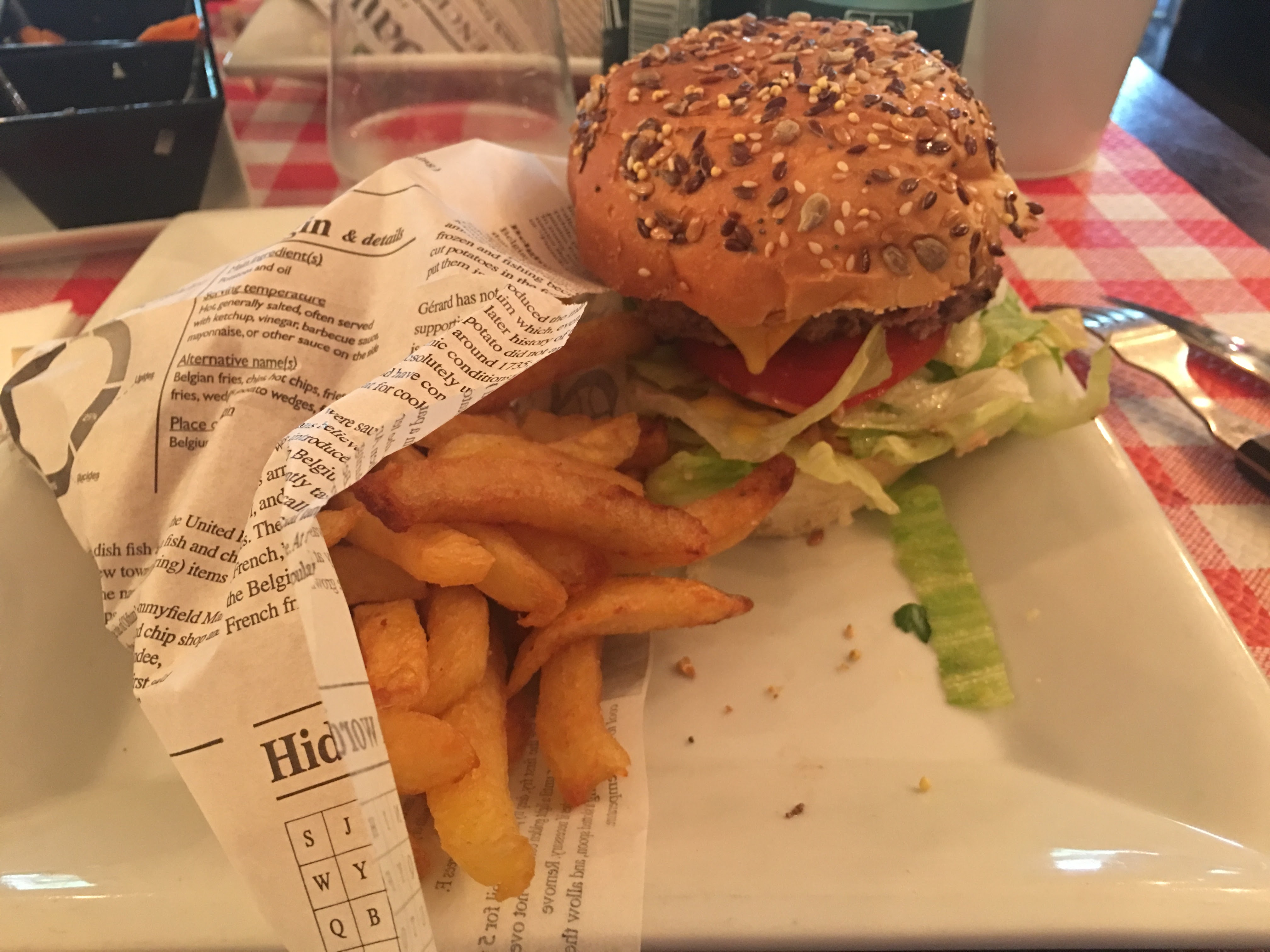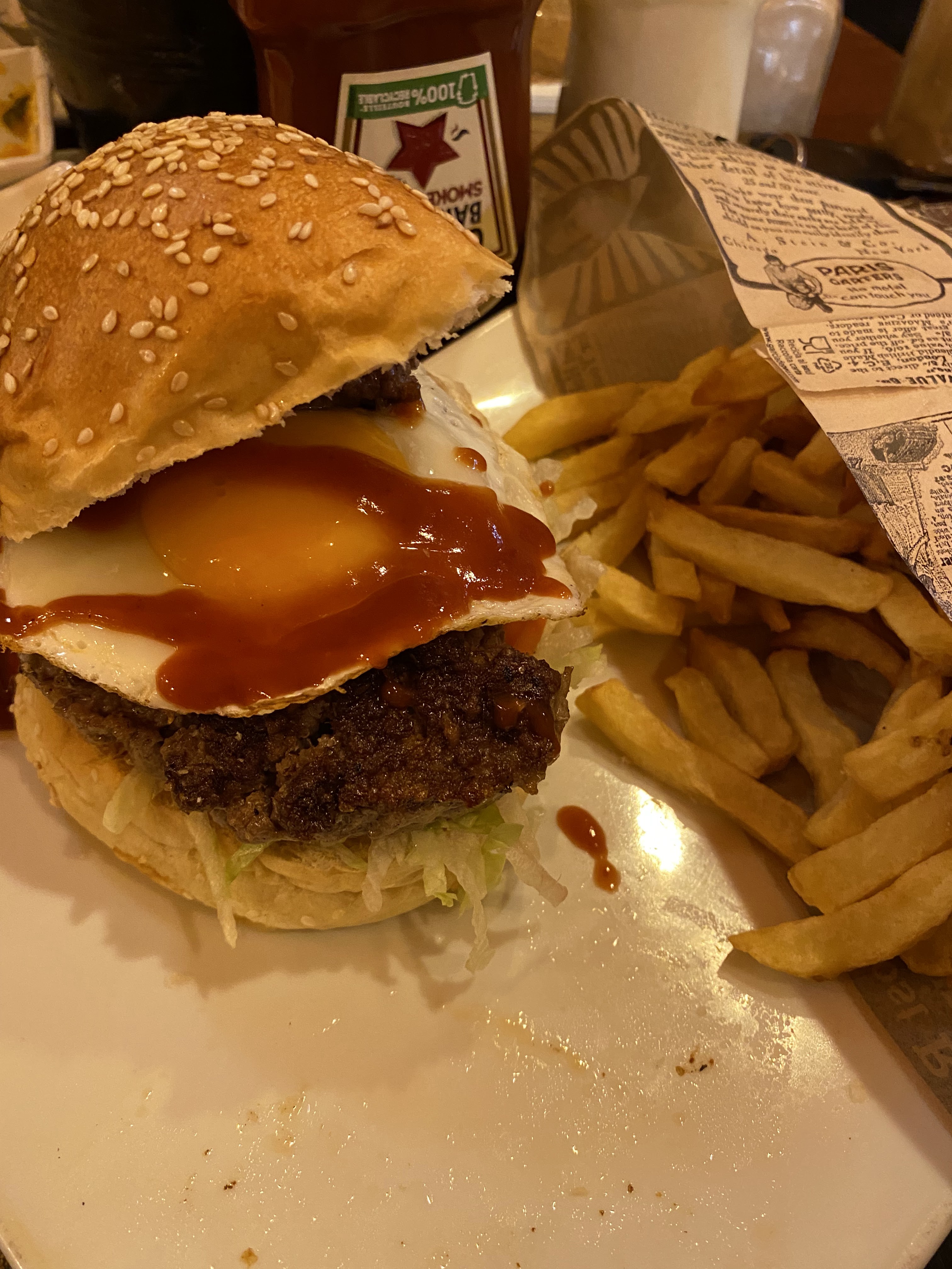 Burger très bien garnit ! Si on aime la quantité, c’est là qu’il faut aller ! Bémols : qualité de la viande hachée moyenne, pain trop lourd et commercial, œuf pas très bien cuit avec trop de blanc, burger sans sauce et trop nature. Il faut rajouter soit même. En résumé c’est réellement un burger simple : steak et pain.