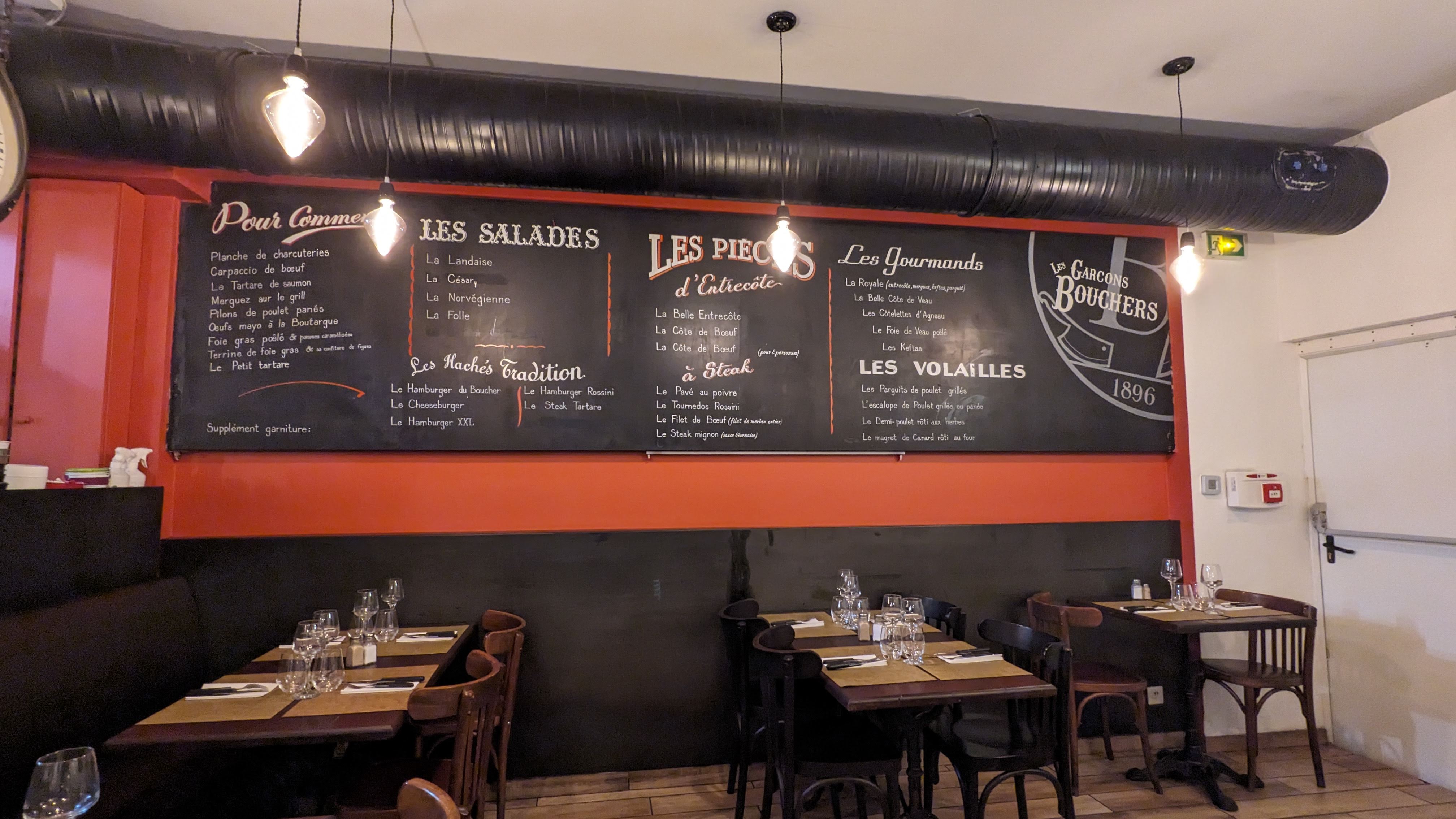 Rénové cet été , le lieu conserve cependant son atmosphère et son ambiance bistrot . L'accueil y est chaleureux , le service au niveau. La carte est complète, les produits frais,les prix ...casher. A déguster absolument , la succulente côte de bœuf accompagnée de ses frites maison: un must . Le plus : les menus du midi, variés , copieux à prix honnêtes. Petits bémols : réservation nécessaire pour un dîner , carte des vins basique, et hygiène des toilettes limite en pic d'affluence. Les garçons bouchers,l'une des meilleures adresses de l'est parisien en restauration cachère !